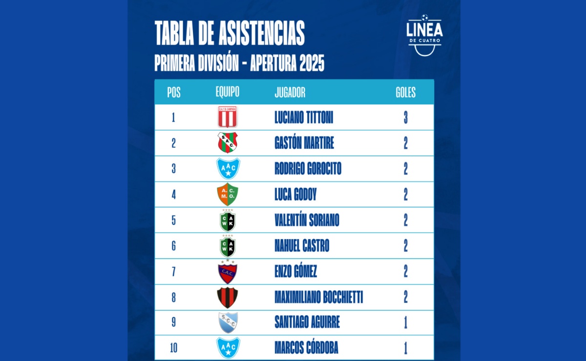 #LigaCañadenseDeFútbol La tabla de asistencias de Primera División tras la Fecha 02 del Torneo Apertura 2025 de la Liga Cañadense.